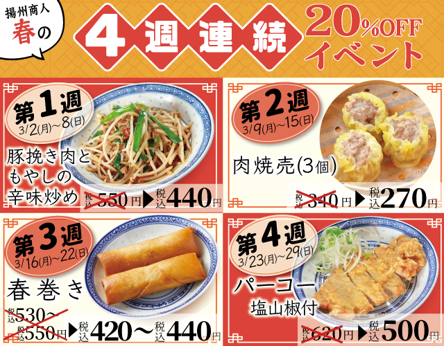 本日3月2日から4週間、週替わりで人気のサイドメニューを20%OFFでご提供!